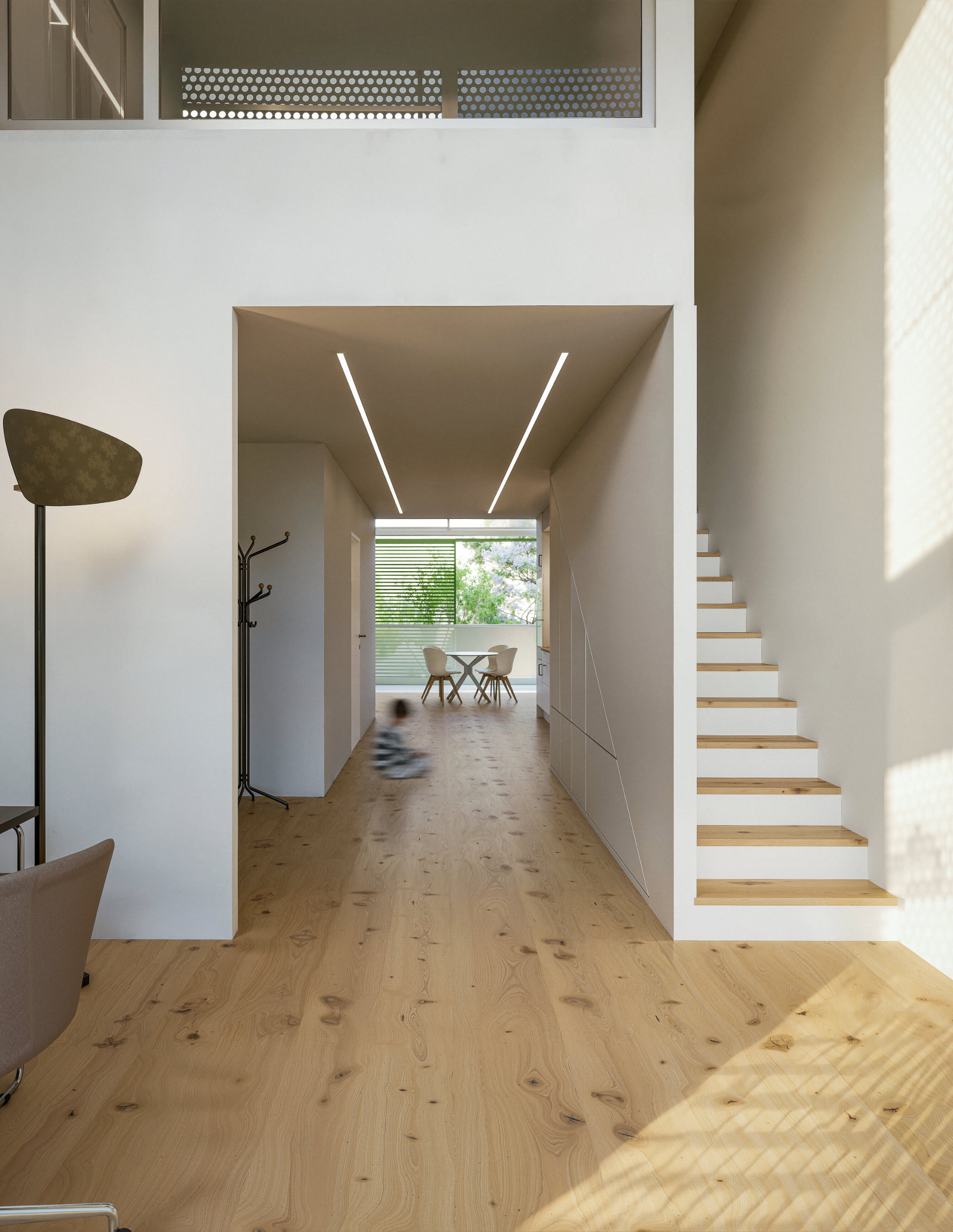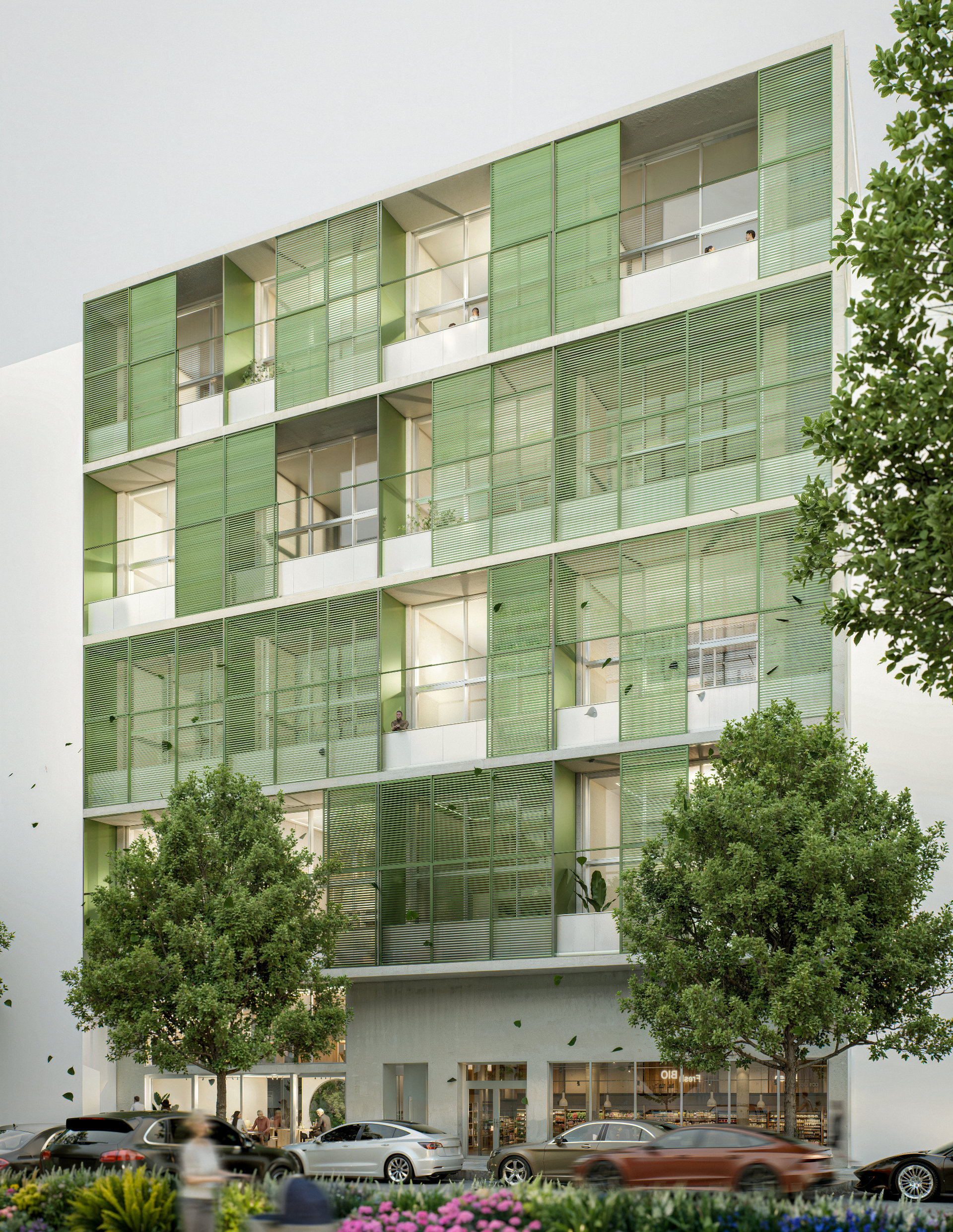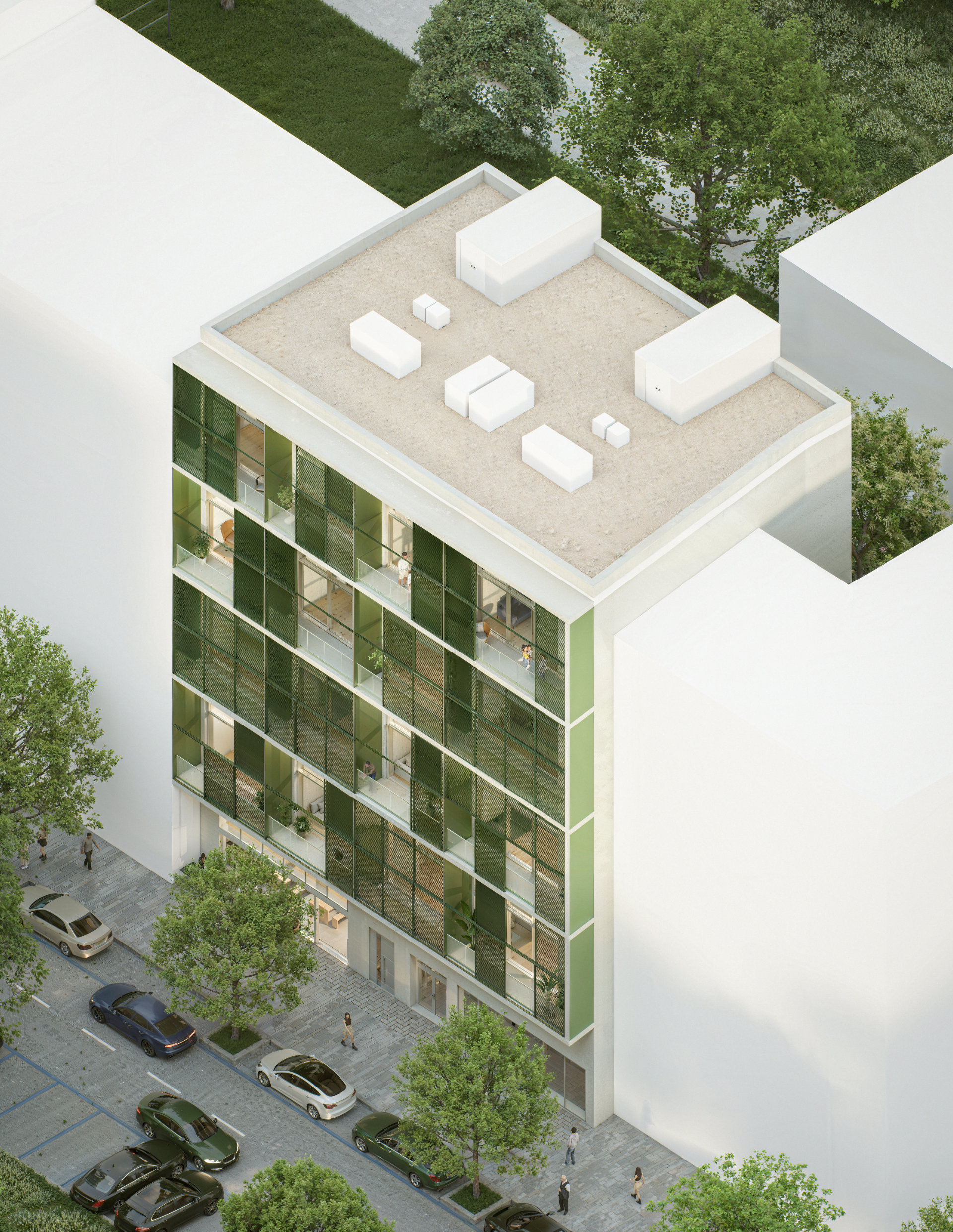 The concept is based on a repeatable loft module, and most of the building consists of identical duplex apartments with an open living space on the lower floor and a bedroom on the gallery, complemented by four atypical units. A striking feature is the system of closable loggias with sliding glass doors, protected by perforated metal panels that act as both a screen and a visual filter for the facade. The roof is designed to be walkable and habitable, with the potential for future extensions, giving the building long-term flexibility and the ability to evolve.