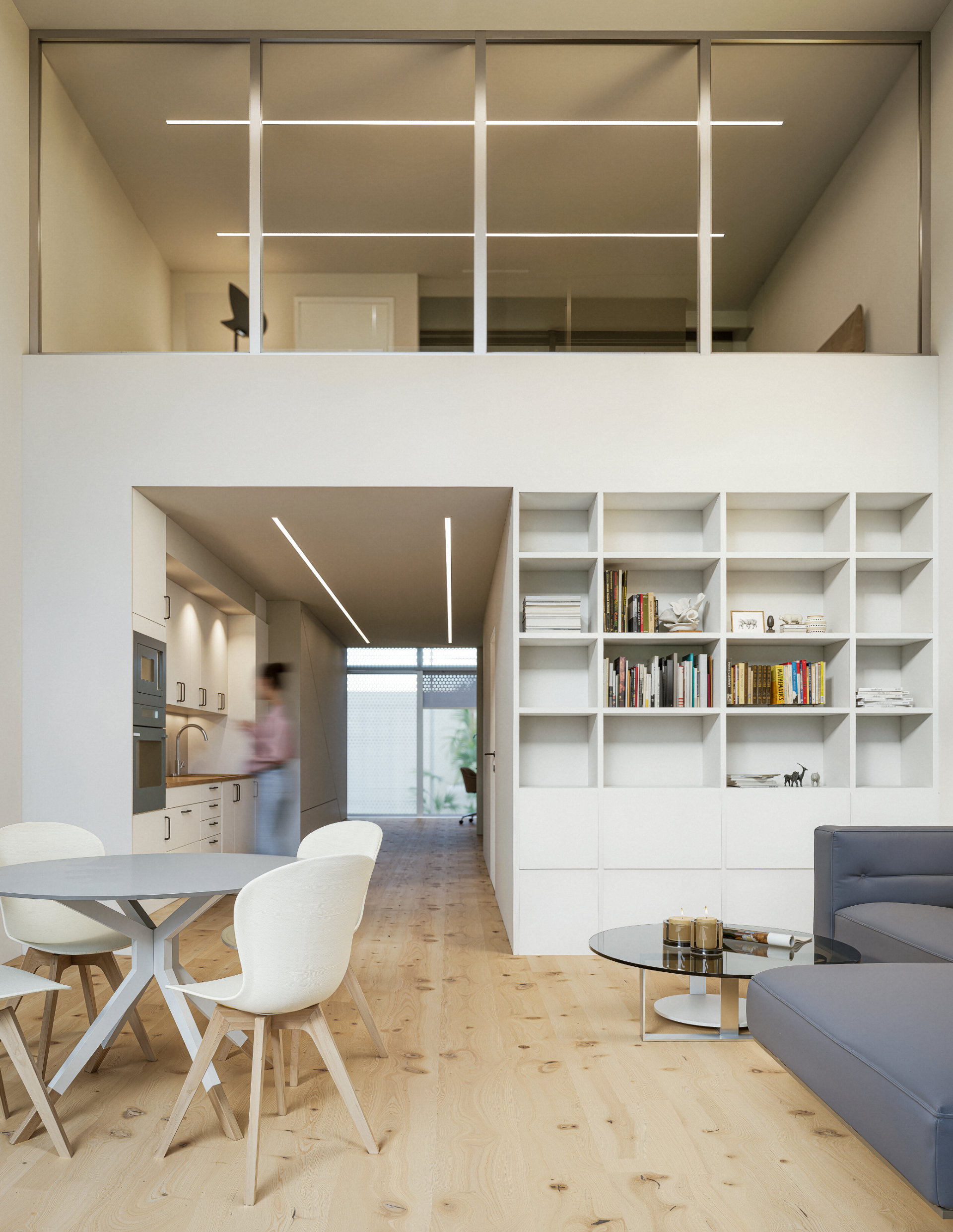 Základem konceptu je opakovatelný loftový modul a většinu domu tvoří identické mezonetové byty s otevřeným obytným prostorem v dolním podlaží a ložnicí na galerii, doplněné o čtyři atypické jednotky. Výrazným prvkem je systém uzavíratelných lodžií s posuvnými prosklenými dveřmi, chráněných perforovanými kovovými panely, které fungují jako stínění i vizuální filtr fasády. Střecha je navržena jako pochozí a obyvatelná, s potenciálem budoucí přístavby, čímž dům získává dlouhodobou flexibilitu a schopnost dalšího vývoje.