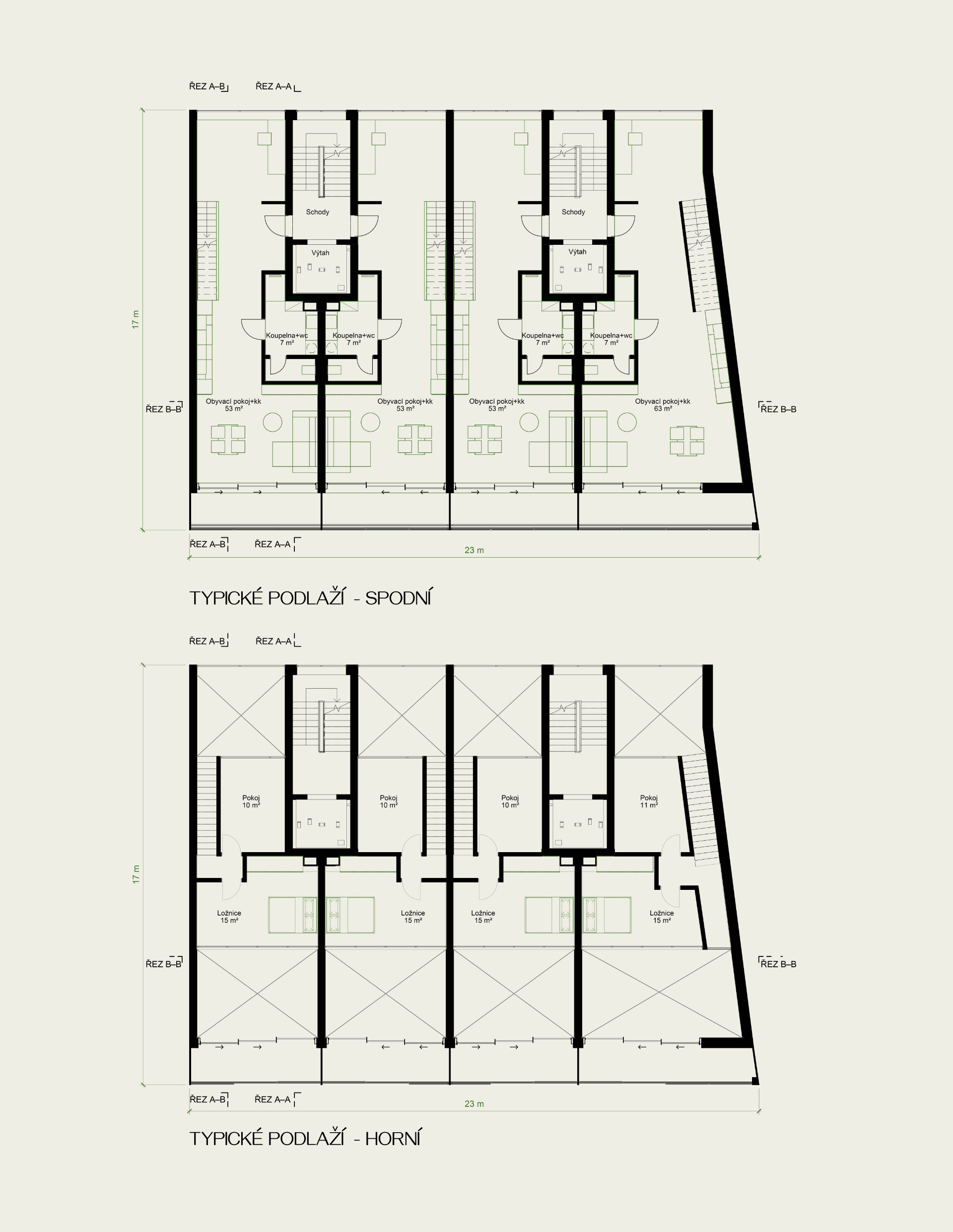 The residential building project in Brno responds to the transformation of the urban structure of the Trnitá district and seeks a contemporary form of urban living based on loft typology. The design works with a simple volume, a repeatable apartment module, and an emphasis on the future adaptability of the building. The combination of open layouts, duplex spaces, and a layered facade with semi-enclosed loggias creates a dynamic relationship between the interior, exterior, and city.